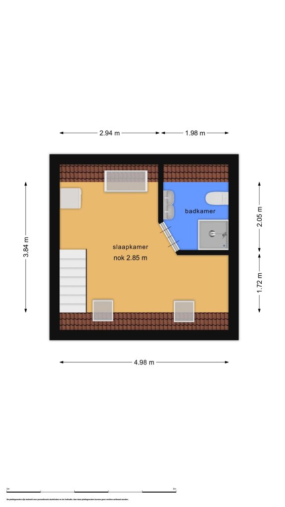 Via de trap bereik je de tweede verdieping. Hier word je direct verrast door de speelse kapconstructie met zichtbare houten balken en de prettige lichtinval via de dakramen. Met een nokhoogte van circa 2,85 meter voelt de ruimte opvallend ruim en luchtig aan.