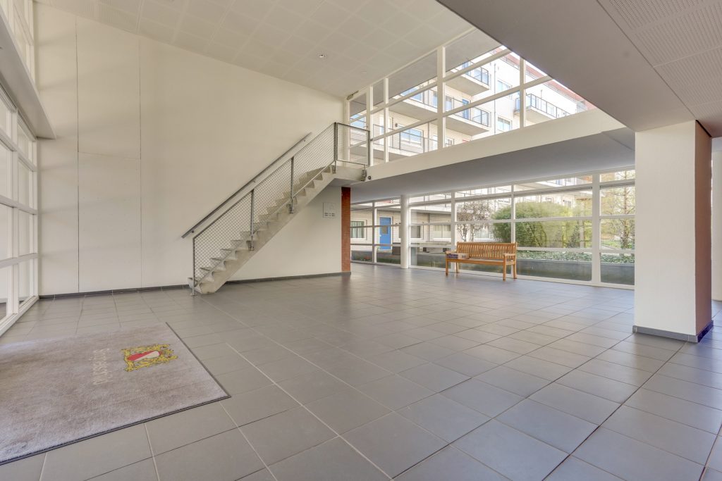 Gemeenschappelijke entree met bellenplateau en brievenbussen. Vanuit de zeer ruime centrale hal bereik je het trappenhuis en de lift. Daarnaast beschikt het appartement over een praktische berging in de kelder, ideaal voor het stallen van fietsen en het opbergen van extra spullen.