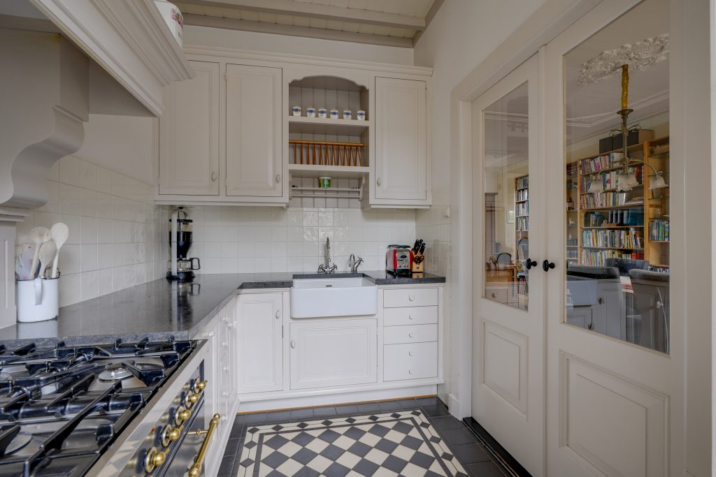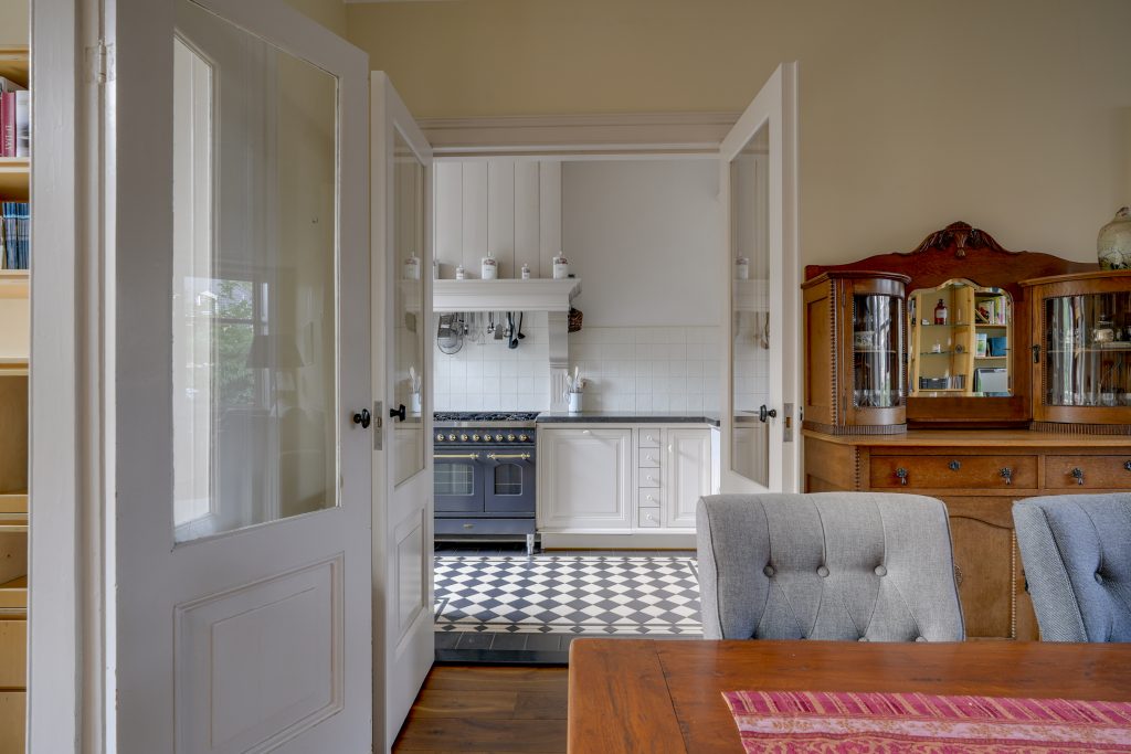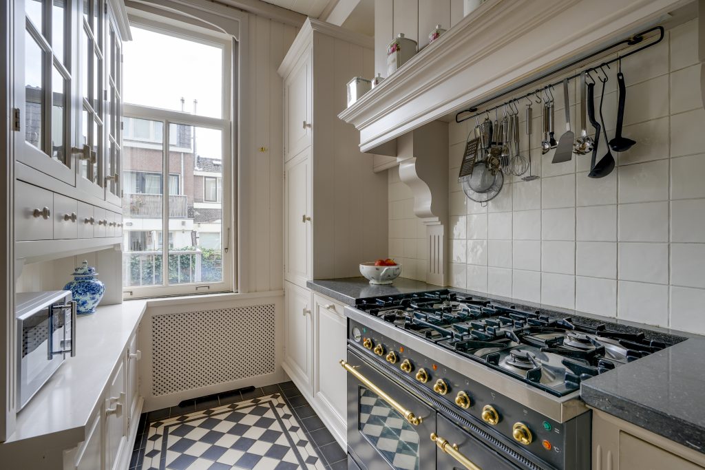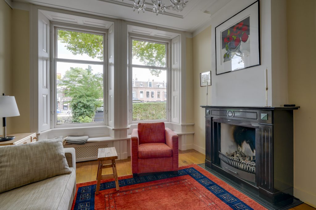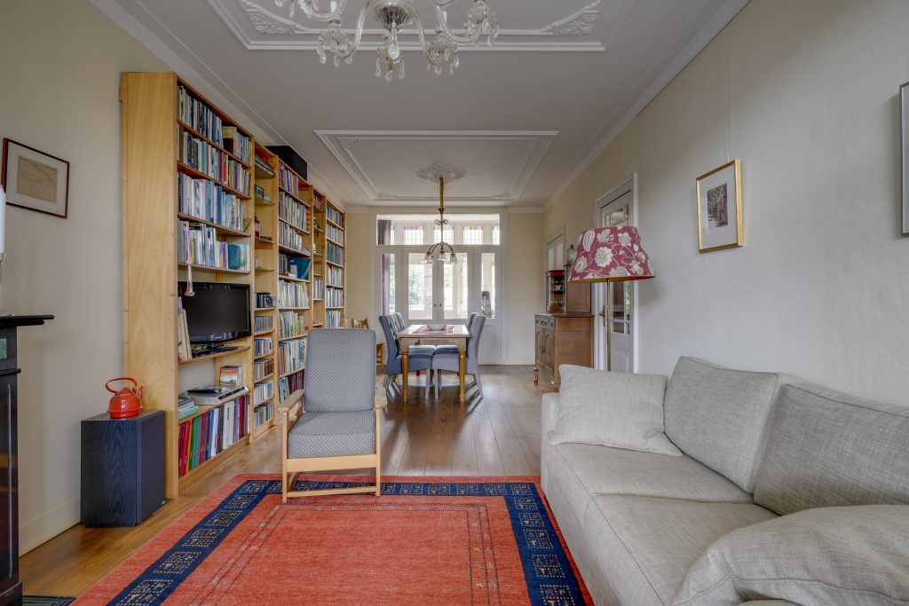 Bij aankomst bij de woning aan de Leidsekade straalt direct het karakter je tegemoet. De statige gevel, de hoge ramen met sierlijke details en de hardstenen trap naar de voordeur geven de woning een klassieke uitstraling die meteen in het oog springt. Via de voordeur met bel en brievenbus kom je binnen in de hal, waar zich ook een toilet bevindt. Vanuit de hal stap je de woonkamer binnen die zich uitstrekt over de volle lengte van de woning. Het hoge plafond met fraaie ornamenten en de elegante details langs de ramen zorgen voor een stijlvolle en lichte uitstraling. Grote ramen aan de voorzijde laten veel daglicht binnen en geven een ruimtelijk gevoel. Dankzij de echte vensterbanken kun je hier heerlijk zitten en uitkijken over het water een plek waar je elk moment van de dag even tot rust komt. Aan de achterzijde bevindt zich een kamer die met deuren kan worden afgesloten en voorzien is van openslaande deuren naar het balkon/terras en de tuin. Boven de deuren zorgen glas-in-loodramen voor extra karakter en lichtinval. Deze ruimte is ideaal in te richten als werkkamer, speelkamer of sfeervolle leeskamer. De keuken ligt apart en kan eveneens worden afgesloten met openslaande deuren. Hierdoor blijven koken en wonen indien gewenst prettig gescheiden, terwijl de ruimte toch een open verbinding houdt met de rest van de verdieping.