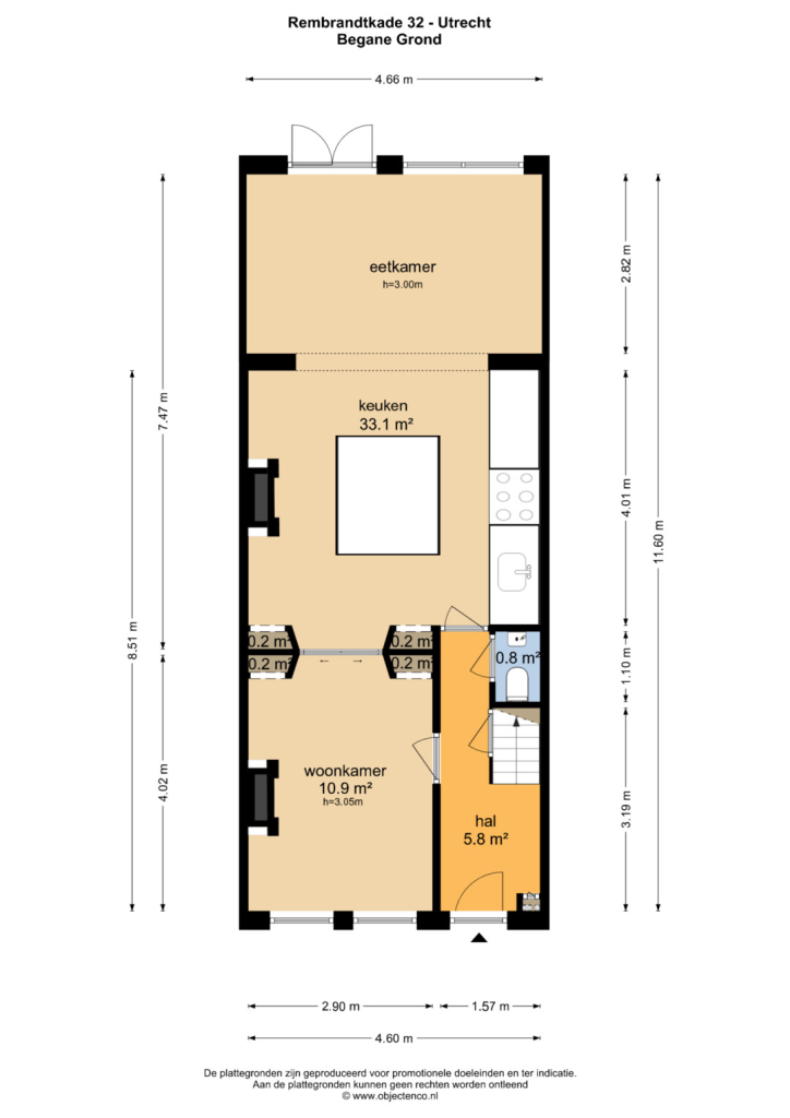Via de entree komt u binnen in de hal met trapopgang en toiletruimte. Vanuit hier opent zich direct de indrukwekkende, van voor tot achter doorlopende leefruimte een prachtig geheel waarin wonen, koken en tafelen naadloos samenkomen. De woning is aan de achterzijde uitgebouwd ten opzichte van veel andere woningen in de straat, wat zorgt voor extra leefruimte en een bijzonder ruimtelijk gevoel op de begane grond.