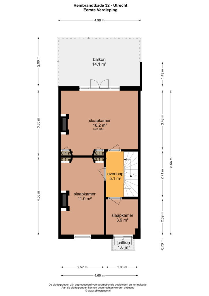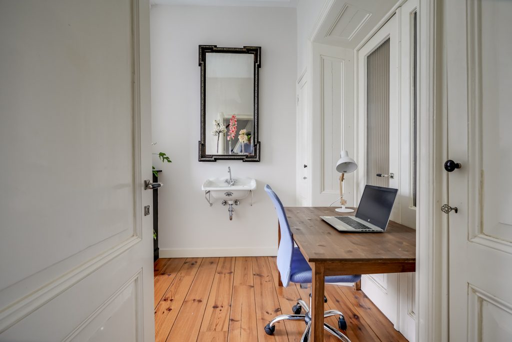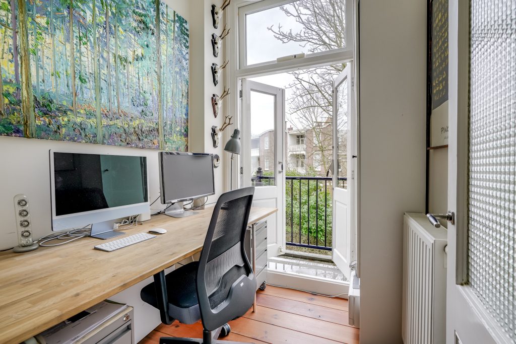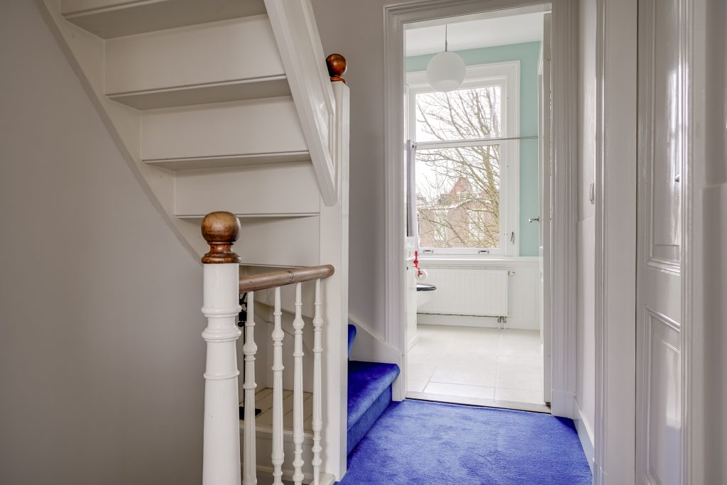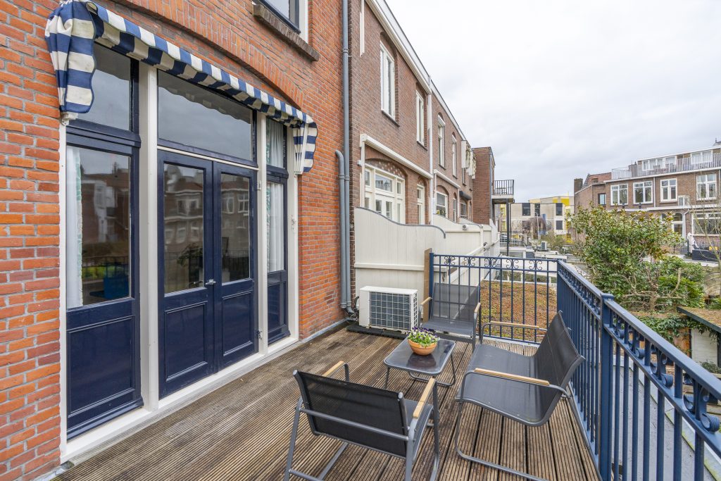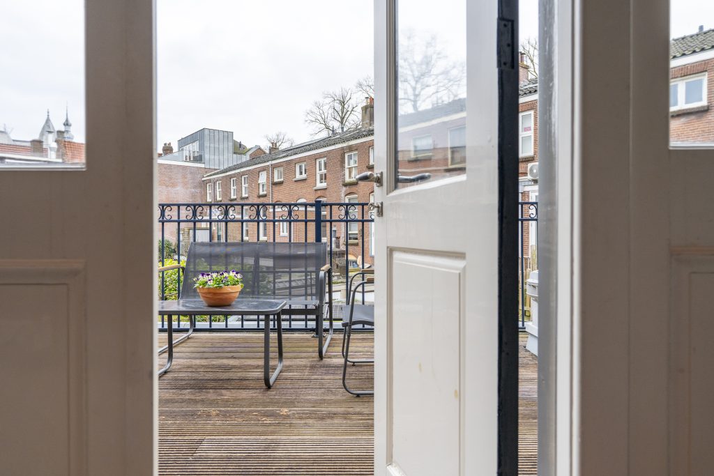 Via de vaste trap bereikt u de eerste verdieping. De overloop vormt het centrale punt en geeft toegang tot drie slaapkamers en het royale balkon aan de achterzijde. De slaapkamer aan de achterzijde is bijzonder ruim en profiteert van een prettige plafondhoogte en veel lichtinval. Via openslaande deuren is het brede balkon op het zuidwesten te bereikbaar een heerlijke plek om in alle privacy van de zon te genieten, rustig wakker te worden met een kop koffie of de dag ontspannen af te sluiten.