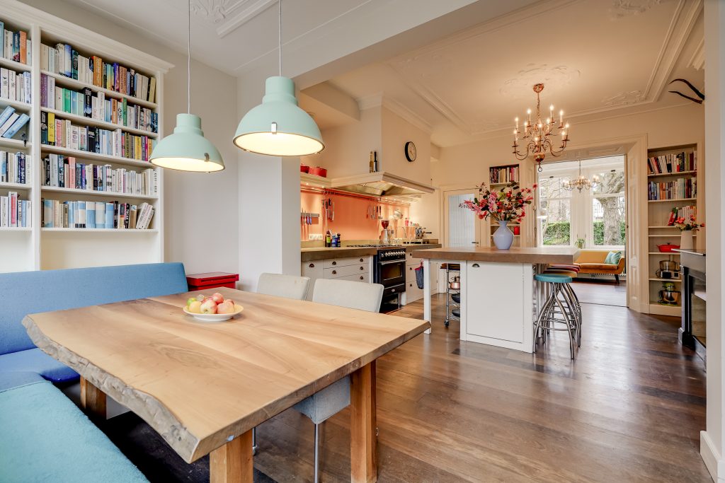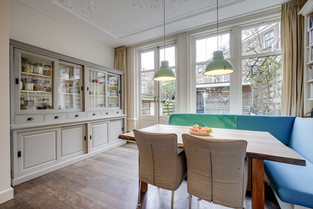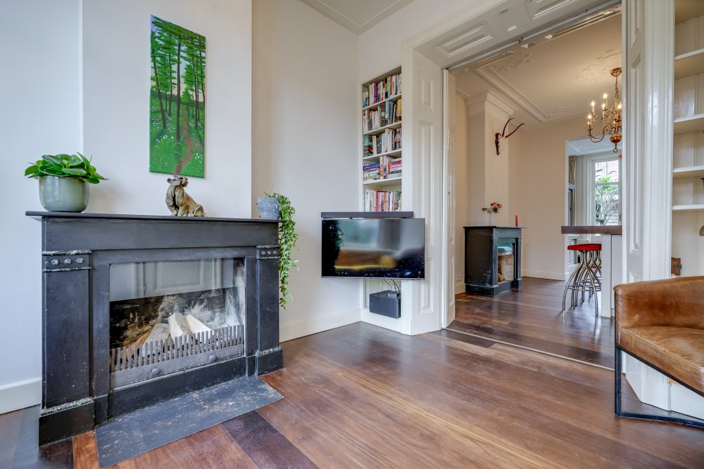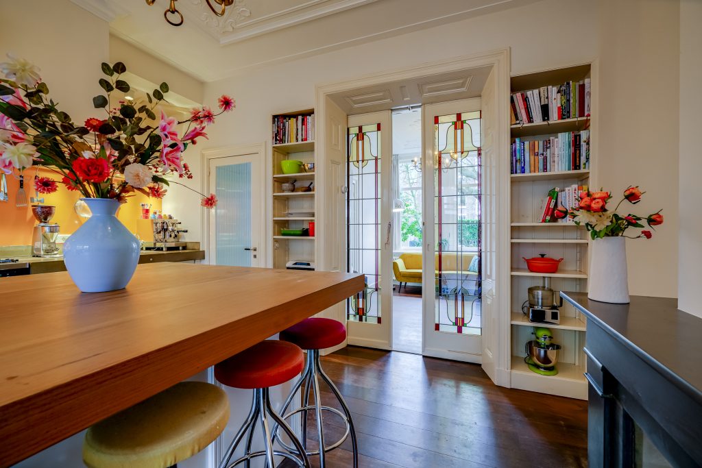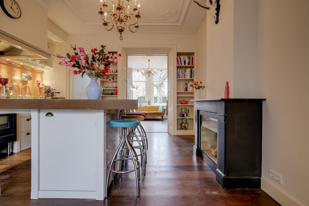 Aan de voorzijde bevindt zich de sfeervolle woonkamer met een plafondhoogte van circa drie meter, rijk voorzien van ornamenten die het karakter van de woning benadrukken. De grote raampartijen zorgen voor een prachtige lichtinval en een vrij uitzicht op het groen aan de Rembrandtkade. Centraal in de woning ligt de royale leefkeuken met kookeiland: een echte blikvanger en het hart van het huis. De keuken is uitgerust met hoogwaardige inbouwapparatuur, waaronder een Boretti oven, en biedt volop werk- en bergruimte. Hier kookt u met gemak voor een groot gezelschap terwijl gasten aanschuiven aan het eiland of plaatsnemen aan de eettafel. De open indeling en de breedte van de woning versterken het gevoel van ruimte en maken deze verdieping ideaal voor zowel dagelijks gebruik als lange avonden tafelen.