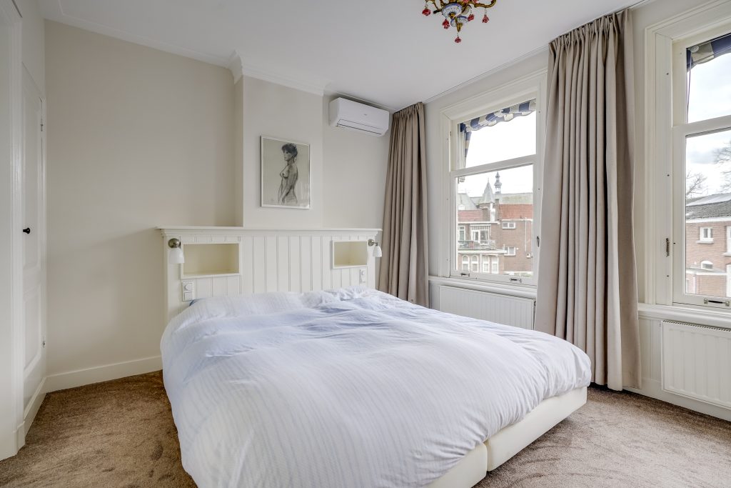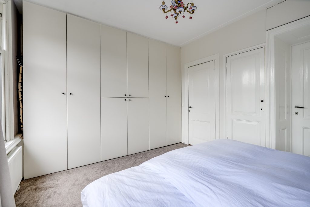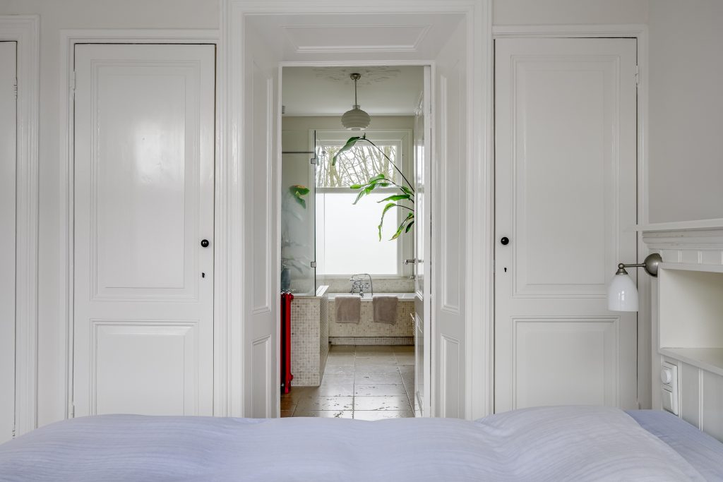 Aan de achterzijde bevindt zich een ruime en rustige slaapkamer met prettige lichtinval en vaste kastruimte. Vanuit deze kamer is direct toegang tot de badkamer, wat het geheel zeer geschikt maakt als comfortabele hoofdslaapkamer. De badkamer is tevens bereikbaar via de overloop en kan aan beide zijden worden afgesloten, waardoor privacy gewaarborgd is, ideaal bij logés of een groter gezin.