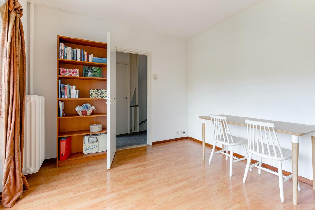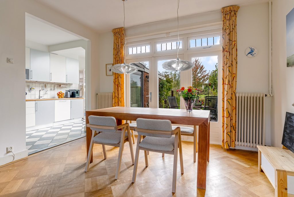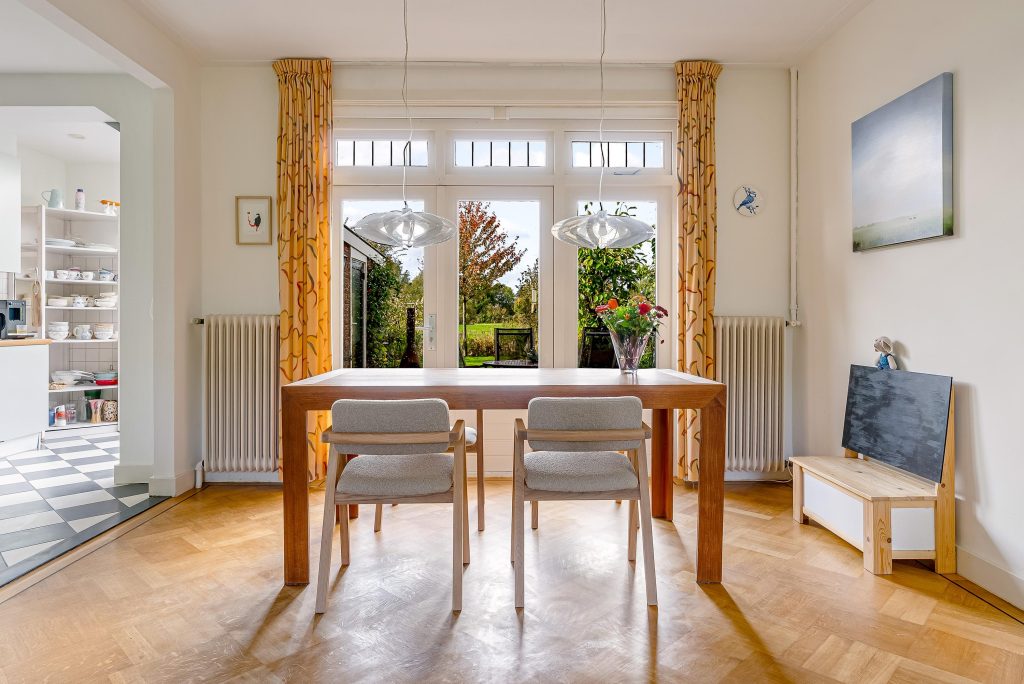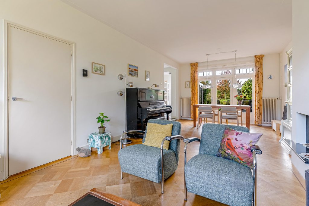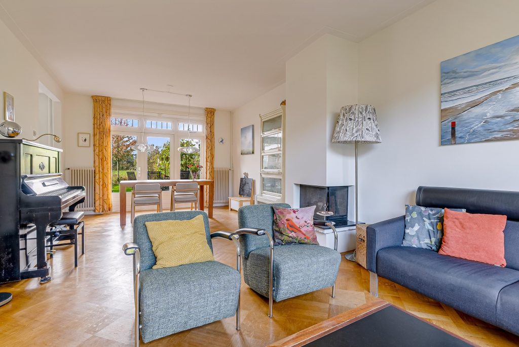 Via de ruime hal met kelder en toilet betreedt u de lichte woonkamer. Grote ramen en openslaande deuren aan zowel de voor- als achterzijde zorgen voor een prachtige lichtinval en een vloeiende verbinding tussen binnen en buiten. De originele parketvloer en de open haard geven het geheel een warme, uitnodigende sfeer.