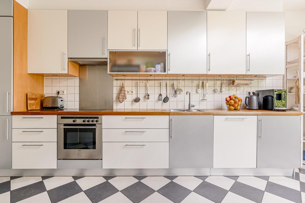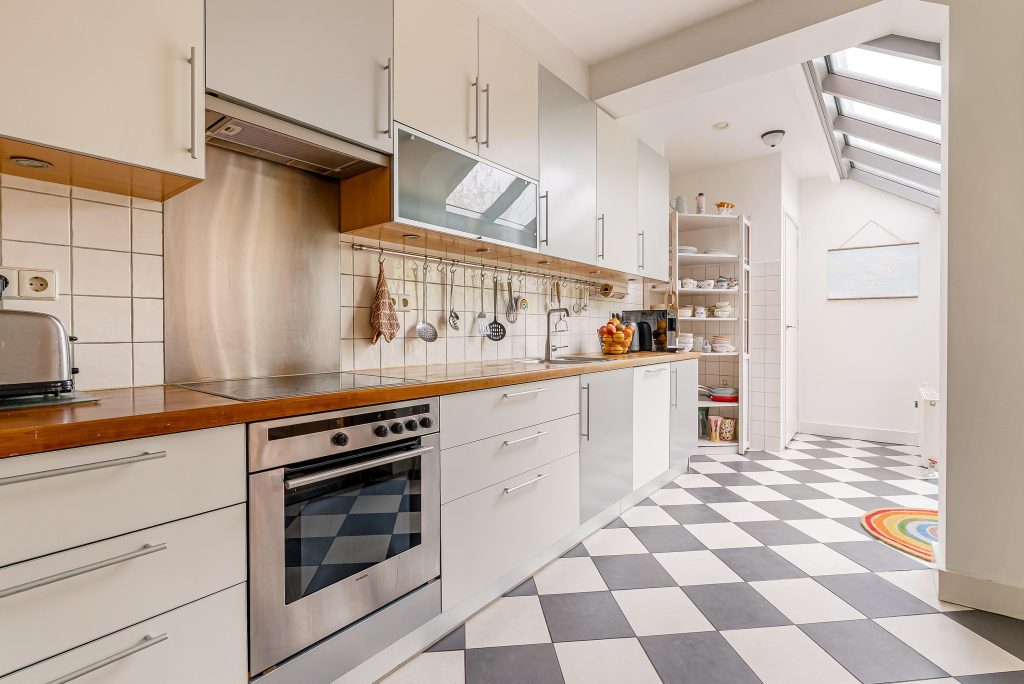 Aan de tuinzijde ligt de ruime keuken, voorzien van inbouwapparatuur, houten werkblad, voldoende kastruimte en een aparte ruimte voor de wasmachine en droger, met water- en elektra aansluiting.