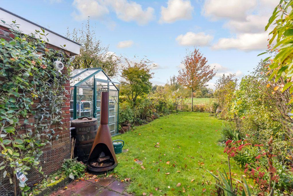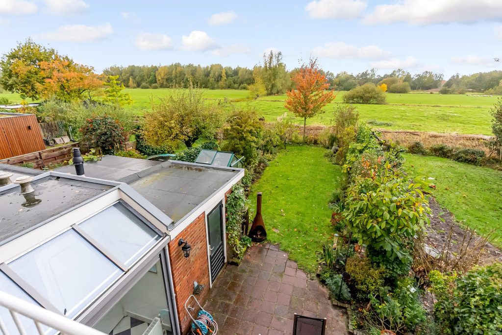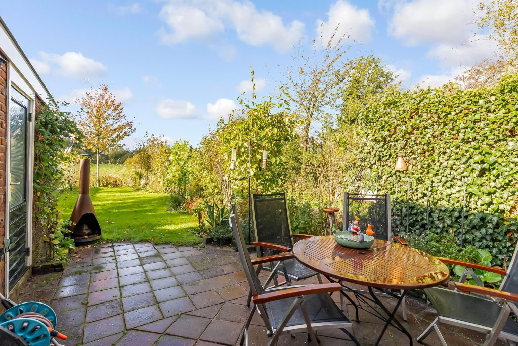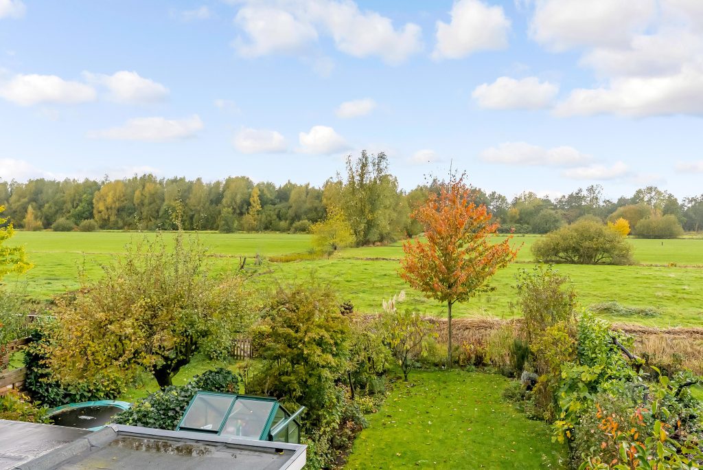 Naast de schuur staat de tuinkas. De achtertuin, circa 20 meter diep, is een oase van rust en privacy. Dankzij de gunstige ligging geniet u hier de hele dag van de zon. Achterin de tuin kijkt u uit over niets anders dan weilanden, bomen en de ondergaande zon. Een uitzicht dat nooit verveelt; elke dag is anders.