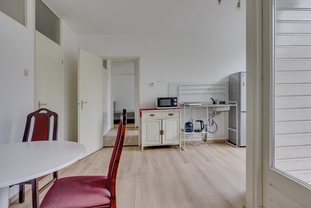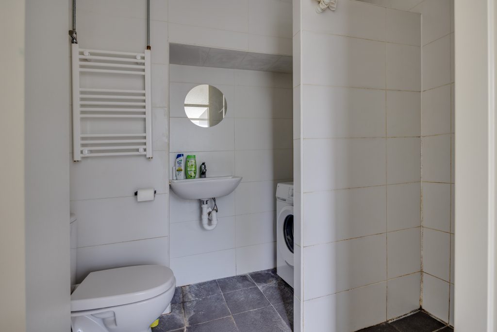 De keuken is praktisch ingericht met voldoende kastruimte en werkbladruimte. Er is plek voor een klein eettafeltje, ideaal voor een ontbijt of een snelle maaltijd. De badkamer is compact maar functioneel, voorzien van een douche, wastafel, toilet en aansluiting voor de wasmachine.