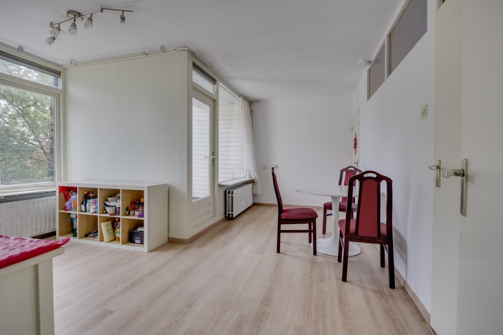 De ruime L-vormige woonkamer biedt veel lichtinval dankzij de grote ramen en heeft een vrij uitzicht op het omliggende groen en water. Er is voldoende ruimte voor zowel een zit- als eethoek, waardoor de woonkamer een prettige centrale plek vormt in de woning. Vanuit de woonkamer is er toegang tot het balkon/loggia op het westen, waar u in de middag en avond van de zon kunt genieten.