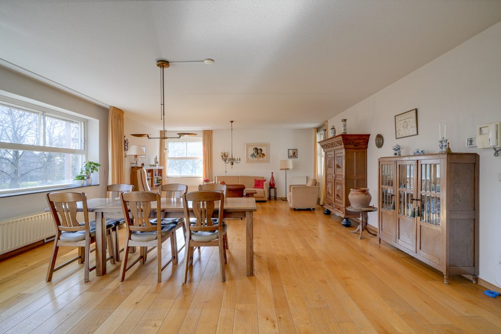 Via de galerij bereikt u de entree van de woning. De hal geeft toegang tot alle vertrekken. De woonkamer bevindt zich aan de voorzijde en is royaal van opzet. Door de brede raampartijen is er veel lichtinval en een vrij uitzicht over het groen en het water van de singel. De ruimte biedt voldoende plaats voor zowel een zithoek als een eethoek.