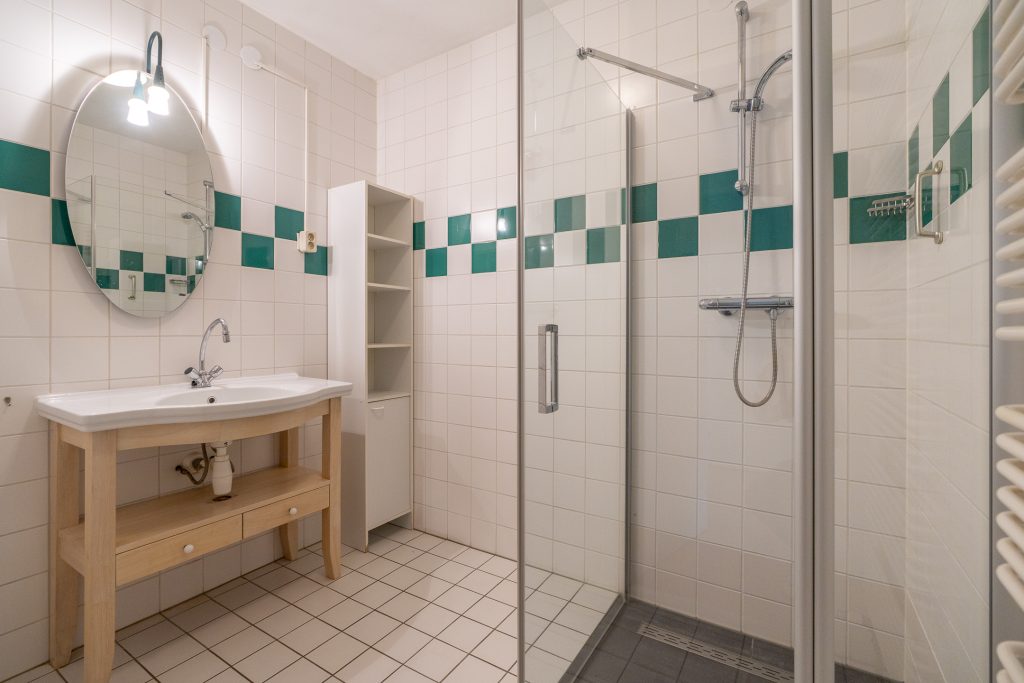 De badkamer is voorzien van een inloopdouche en een wastafel. Het toilet is separaat. Tevens is er een interne berging met aansluiting voor de wasmachine en extra bergruimte.