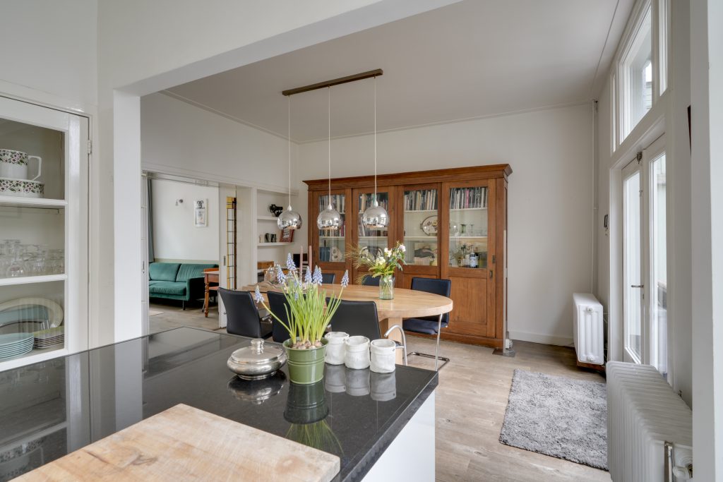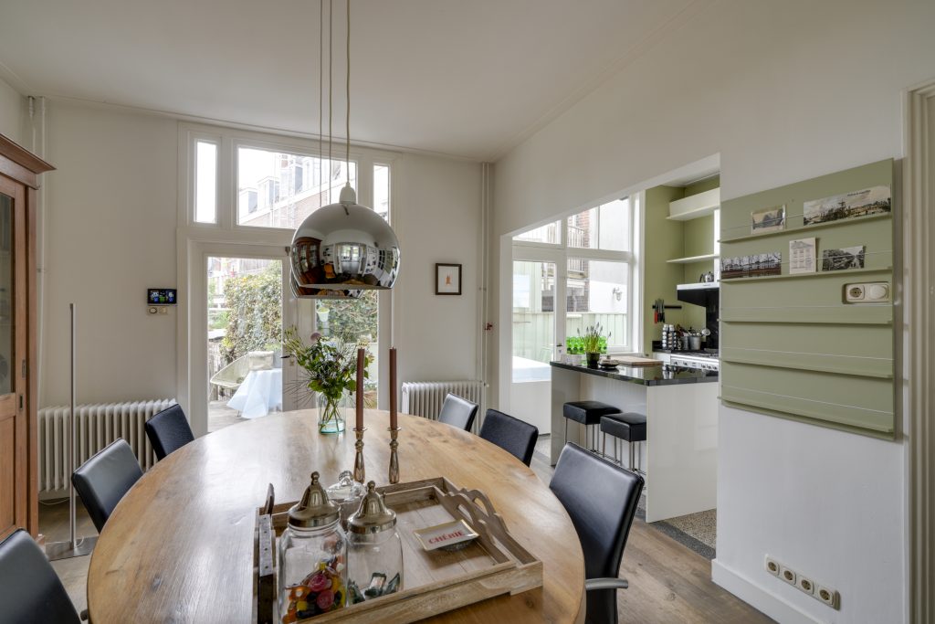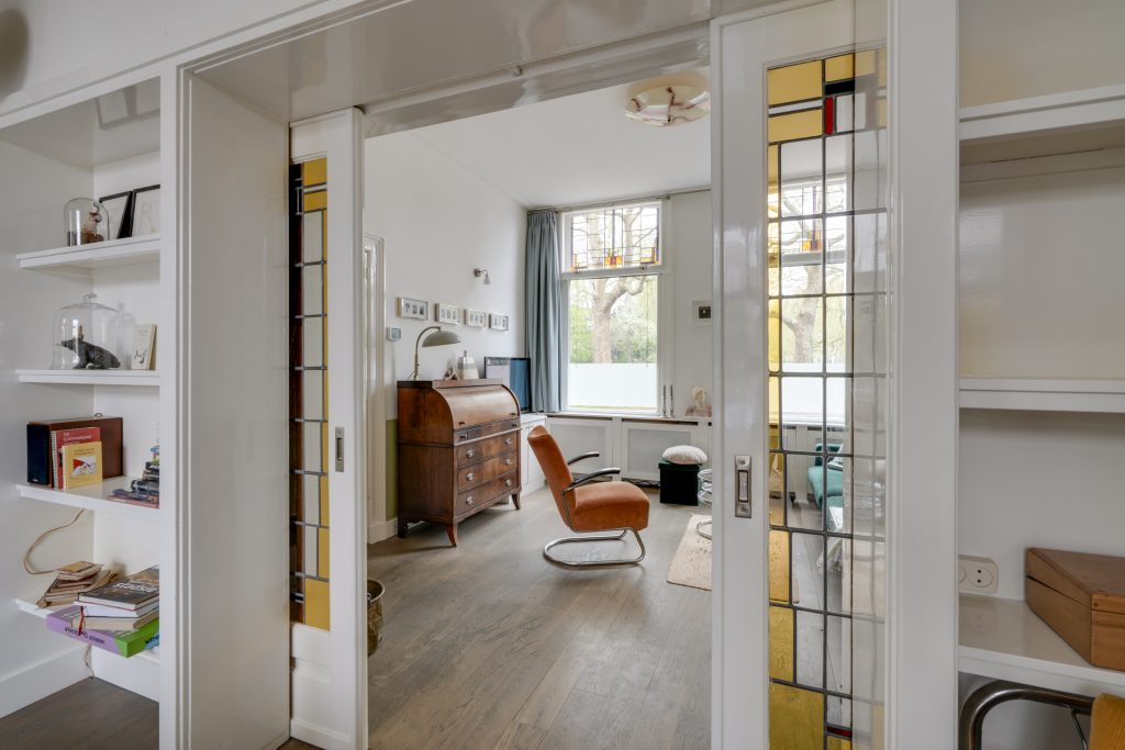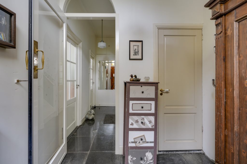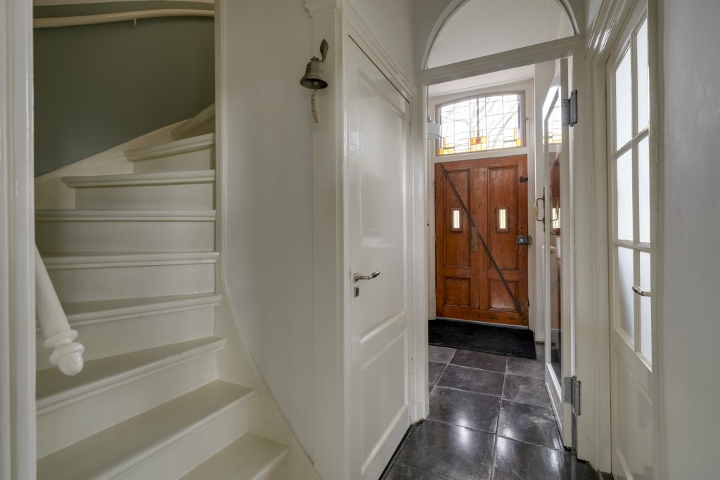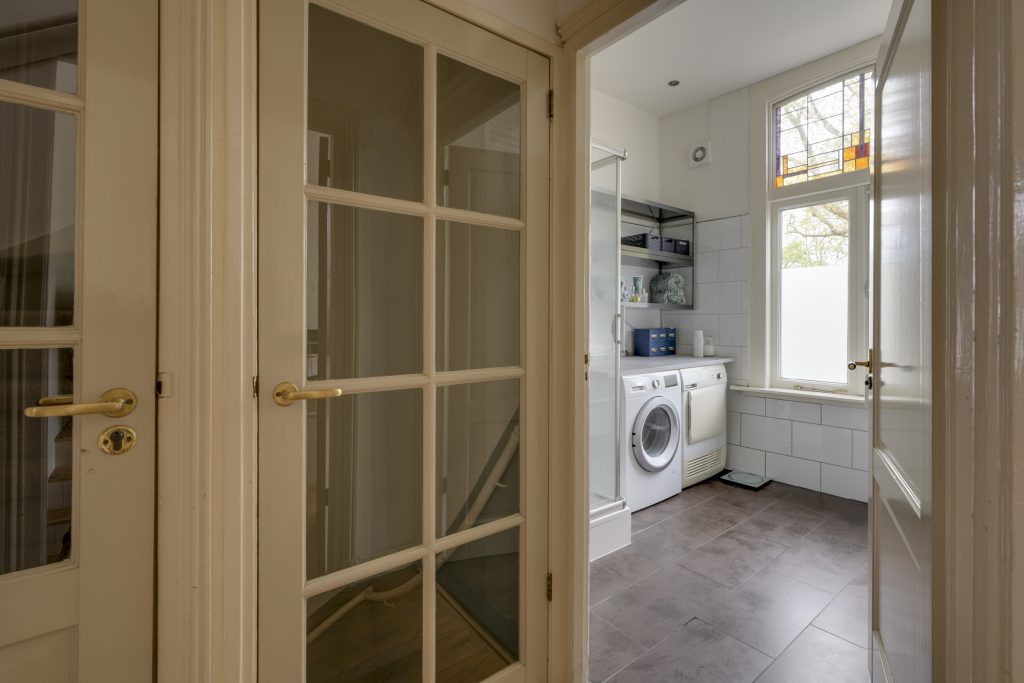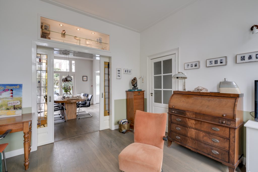 U betreedt de woning via de klassieke entree en komt in een ruime hal met een fraaie trapopgang en toegang tot de KELDER op stahoogte – ideaal voor opslag of als hobbyruimte. Aan de voorzijde bevindt zich de sfeervolle woonkamer met karakteristieke glas-in-loodramen. Via de originele kamer-en-suite deuren komt u in de royale eetkamer die middels openslaande deuren toegang biedt tot het terras en de achtertuin. De ruime keuken is voorzien van diverse inbouwapparatuur en een fijne vaste kast. Dankzij de royale opzet en het prachtige lichtinval is het hier heerlijk koken. Een ideale plek om samen met vrienden en familie te genieten van gezellige diners en lange avonden.