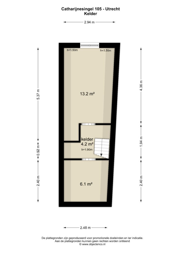 Vanuit de hal bereikt u de zeer royale KELDER waarin zich 2 kamers bevinden van resp. 6,1 m²en 13,2 m².