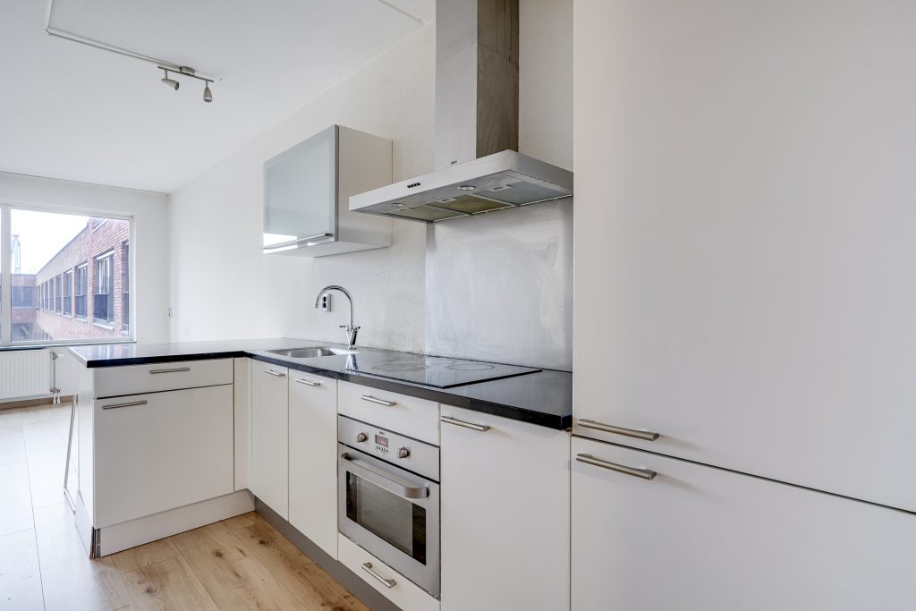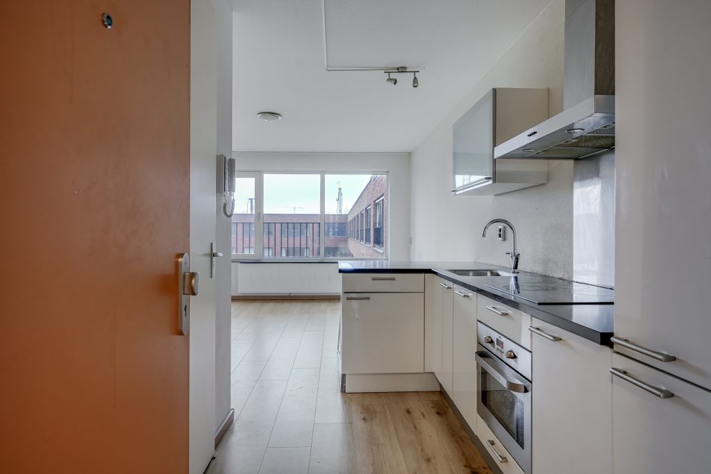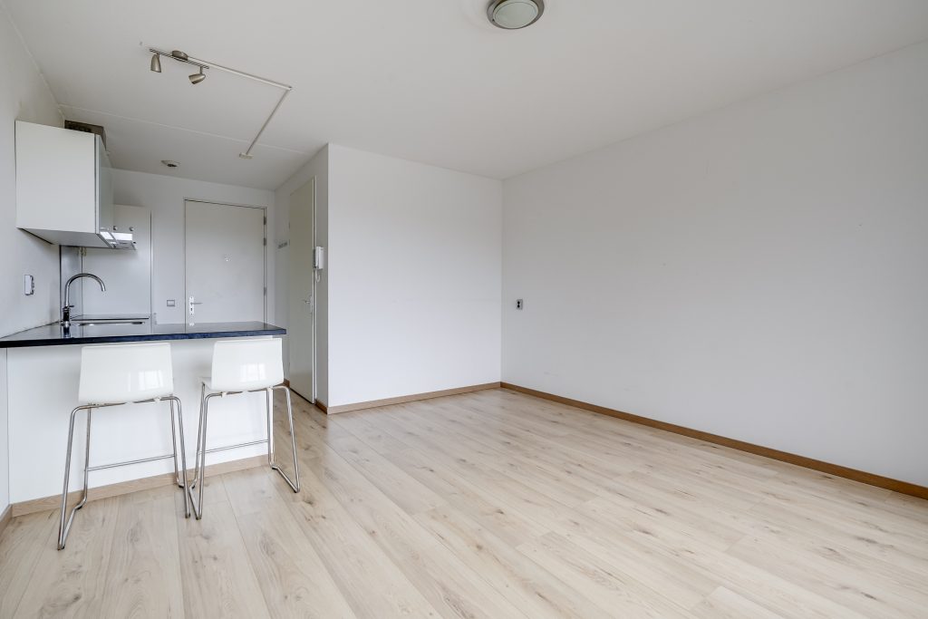 Je komt binnen en stapt meteen de open keuken in. De keuken is strak, licht en praktisch ingericht met diverse inbouwapparatuur. De keuken loopt mooi door en eindigt in een gezellige eetbar: dé plek voor een snelle espresso in de ochtend, een borrel met vrienden of om ’s avonds aan te schuiven met je laptop en een goed glas wijn. De bar vormt een natuurlijke overgang en maakt de ruimte net wat speelser en socialer. Vanuit hier loop je door naar de woon-/slaapkamer. Een fijne, open ruimte met voldoende plek voor zowel een comfortabele zithoek als een slaapgedeelte. De grote ramen zorgen voor veel daglicht en geven het appartement een fijne sfeer waardoor het ook extra ruim aanvoelt. De badkamer is netjes en functioneel ingericht, met een douche, wastafelmeubel, toilet en aansluiting voor de wasmachine met eventueel een droger bovenop. Alles compact, maar logisch ingedeeld en precies wat je nodig hebt voor comfortabel dagelijks wonen.