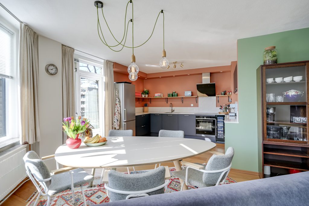 De open luxe keuken sluit aan op de eethoek en is van alle gemakken voorzien met diverse inbouwapparatuur, waardoor je hier comfortabel kunt koken. Vanuit de woonkamer heb je toegang tot het balkon welke is gelegen op het zuidwesten, dat zich uitstrekt over vrijwel de volledige lengte van de woning. Dankzij deze gunstige ligging kun je hier heerlijk genieten van de middag- en avondzon. Een fijne plek om na een lange dag tot rust te komen met een goed glas wijn, een boek of gezellig met vrienden.
