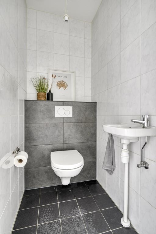 Direct bij binnenkomst aan de rechterzijde is de bergkast met wasmachine aansluiting gesitueerd. Daarnaast is er nog een apart toilet aanwezig, wat zorgt voor extra comfort en functionaliteit.
